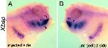Figure 4. Molecular changes in morpholino-injected Xenopus embryos. A,B: Embryos were injected with Mo2 and analyzed at stage 37. RNA encoding the lineage tracer β-galactosidase was co-injected to identify the injected side (red). Xbap is normally expressed in the first arch, as shown in B, and marks predominantly the precursors to the palatoquadratecartilage, which contributes to the structures of the mandibular arch (m). A shows the lateral view of the injected side of the same embryo, showing ectopic expression of Xbap (black arrowhead) selectively in the second, hyoid (h), arch.