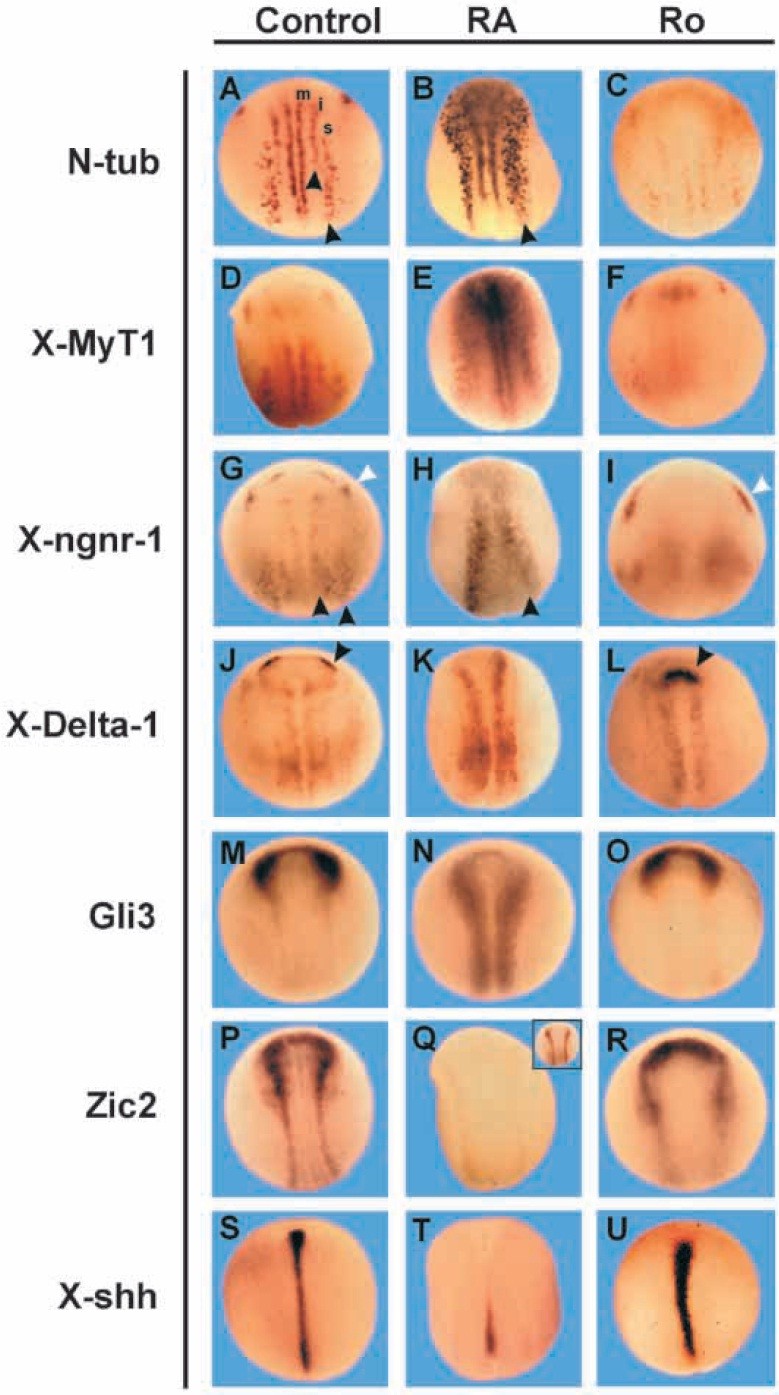 Fig. 1. RA exposure during gastrulation increased the expression of activators and repressed the expression of inhibitors of primary neurogenesis, while the retinoid antagonist Ro produced the opposite results. Embryos were untreated (Control column), treated with RA (RA column) or treated with Ro 41-5253 (Ro column) and the effect on the expression of different components of the primary neurogenesis cascade was evaluated by in situ hybridization at neurula stage. All panels are dorsal views (anterior up). (A-C) Ntubulin (N-tub) domains were strongly expanded by RA (B; 54%, n=24 for 1 mMRA; 100%, n=44 for 10 mM RA). The stripes of sensory neurons and interneurons were merged (compare arrowheads between A and B) and shifted anteriorly. Ro certainly reduced Ntubulin expression (C, 83%, n=12 for 1.5 mM Ro) and stripes appeared more distant than in control embryos. m, i and s, primary motor neurons, interneurons and sensory neurons, respectively. (D-F) X-MyT1 domains were expanded and shifted anteriorly after RA treatment (E, 100%, n=8 for 1 mM RA; 100%, n=6 for 10 mM RA). Ro clearly reduced X-MyT1 expression in the neural plate (F, 100%, n=8 for 1.5 mM Ro). (G-I) X-ngnr-1 expression was increased, stripes were merged (compare black arrowheads in G and H) and shifted anteriorly, while trigeminal expression (white arrowhead in G) was lost in RA-treated embryos (H, 61%, n=33 for 1 mM RA; 72%, n=29 for 10 mM RA). Ro reduced X-ngnr-1 expression in the neural plate but enlarged the trigeminal domain (white arrowhead; I, 21%, n=14 for 1.5 mM Ro; 20%, n=10 for 4 mM Ro). (J-L) X-Delta-1 domains were increased, merged and shifted anteriorly in response to RA treatment, while the most-anterior domain (arrowhead in J) was lost probably due to posteriorization (K, 50%, n=16 for 10 mM RA, 38% n=16 for 1 mM RA). Ro changes the expression pattern of XDelta- 1 resolving the longitudinal stripes into a bilateral one towards the dorsal midline, while the anterior domains (arrowhead) converge (L, 30%, n=10 for 1.5 mM Ro). (M-O) RA treatment resulted in a widespread expansion of Gli3 over the mediolateral axis in the posterior neural plate, and the anterior domain was markedly reduced (N, 100%, n=10 for 1 mM RA; 100%, n=10 for 10 mM RA). Ro treatment only reduced the posterior expression (O, 67%, n=9 for 4 mM Ro; 63%, n=8 for 7.5 mM Ro). The low levels of Gli3 expression in the posterior domain in control embryos makes the comparison with Ro-treated embryos difficult. (P-R) RA produced a dosedependent abolishment of Zic2 expression (Q, complete lost, 100%, n=10 for 10 mM RA; posterior reduction and anterior lost, 100%, n=10 for 1 mM RA, see inset). Ro treatment dispersed Zic2 expression over the mediolateral axis in the posterior neural plate (R, 30%, n=10 for 4 mM Ro; 40%, n=10 for 7.5 mM Ro). (S-U) X-shh expression was strongly reduced in the posterior level and was completely abolished in the anterior notochord and floor plate after RA treatment (T, 100%, n=23 for 10 mM RA). Ro-treated embryos showed a clear increase of X-shh along the dorsal midline (U). |