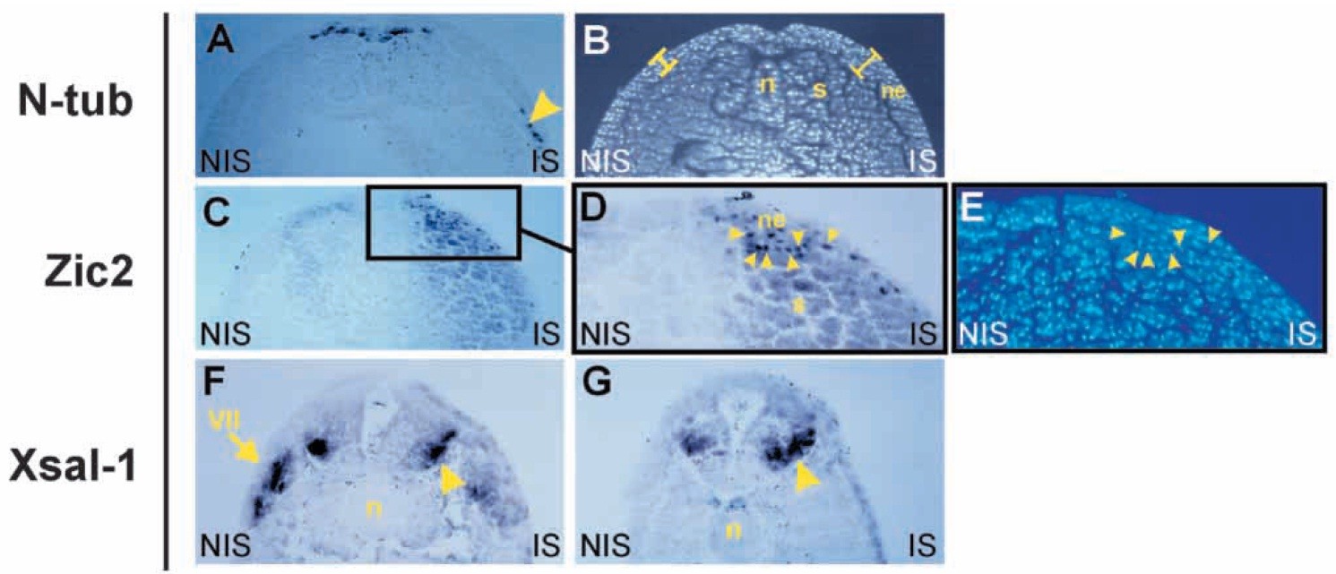 Fig. 3. Cross sections of X-shh- and X-bhh-injected embryos at neurula stage (A-E) and tadpole stages (F,G). Dorsal side is up. IS, injected side; NIS, non-injected side; n, notochord; ne, neural ectoderm; s, somites. (A) N-tubulin distribution shows the ventral displacement of the primary sensory neurons stripe (arrowhead) in the IS. (B) Hoechst nuclear labeling revealing the increased cell number in the IS including the neural ectoderm (compare bars). (C,D) Zic2 expression. Note the expansion in the neural ectoderm and mesoderm in the IS in C. The inset shown at higher magnification in D shows the very active transcription of Zic2 in nuclei (arrowheads) of the IS. (E) The same section as in D revealed for Hoescht staining, confirms the nuclear location (arrowheads) of Zic2 transcripts. (F,G) Xsal-1 expression is downregulated in the VIIth cranial ganglion (arrow in F) and reveals an expansion of ventral secondary neurons within the neural tube (arrowheads in F and G) in the IS. |