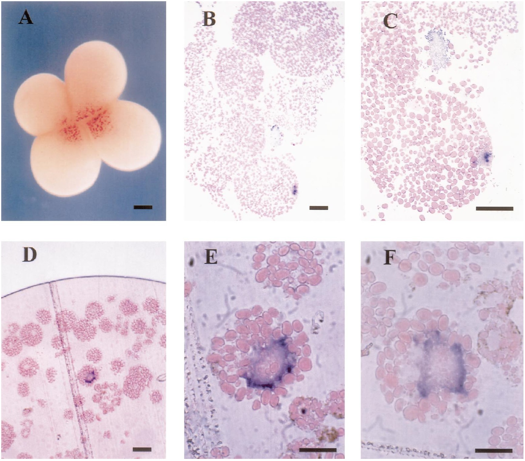 Fig. 1. Xcat2 RNA follows the same distribution pattern as germ plasm. (A) Whole-mount in situ of a four-cell embryo; vegetal pole view showing Xcat2 positive germ plasm islands. (B-F) Whole-mounts of dissociated embryonic cells embedded in plastic and sectioned at 1 mm. (B) Cells from a stage 7 embryo. Note the one Xcat2 staining cell. (C) Higher magnification of pPGC shown in (B). Note that Xcat2 staining is in a yolk-free area, the germ plasm, close to the plasma membrane. (D) Cells from a stage 10 embryo showing one Xcat2 positive pPGC. (E) Higher magnification of pPGC seen in (D) showing the perinuclear Xcat2 staining. (F) Another Xcat2 positive pPGC at stage 10 at high magnification. Scale bars, (A) 200 um; (B) 50 um; (E-F) 20 um.
