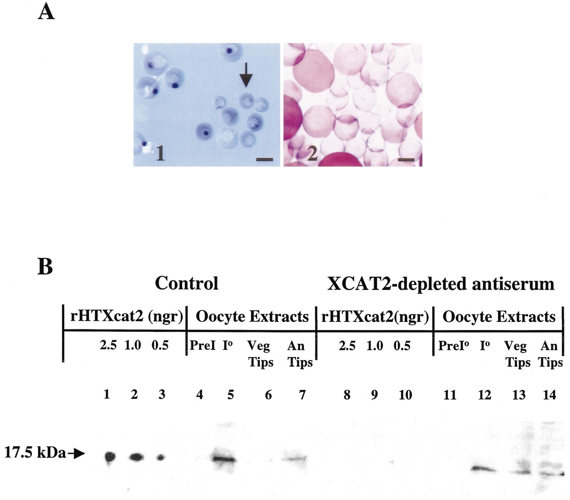 Fig. 4. Xcat2 RNA is not translated during oogenesis. (A) In situ analysis of Pre I and stage I oocytes for Xcat2 RNA. (1) Mixed Pre-I to stage II oocytes; arrow indicates group of Pre I oocytes. (2) Pre I to stage II oocytes hybridized with sense RNA probe (control). Scale bars, 50 mm. (B) Western blot analysis of oocyte extracts with Xcat2 depleted antiserum. Lanes 1, 2, 3, 8, 9 and 10 are lanes loaded with decreasing levels of rHTXcat2 protein in ng as a control for antiserum depletion. Lanes 1-7 were incubated with control depleted antiserum (depleted of anti-HisTag antibodies); lanes 84 were incubated with antiserum depleted of anti-Xcat2 antibodies. Each depleted antiserum was incubated 4 with the depleting antigen source. Oocyte equivalents per lane: Pre I, 500; stage I, 2000-4000 (25 ml); vegetal tips, 43; animal tips, 37. Arrow indicates 17.5 kDa, the mass of rHTXcat2. Note that the endogenous 17.5 kDa band is evident with serum depleted of Xcat2 antibodies (lanes 124).
