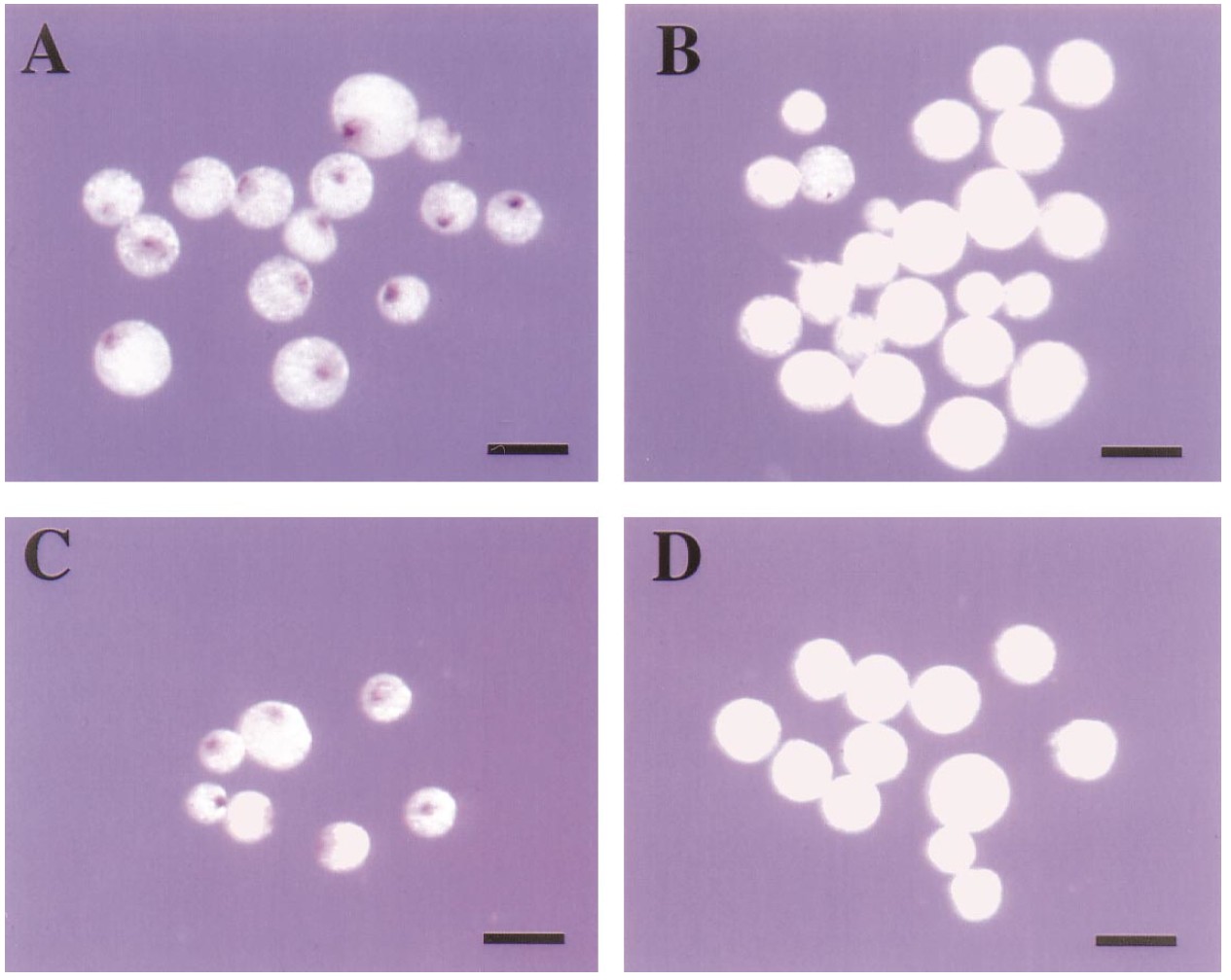 Fig. 7. Xcat2 protein is present in PGCs of early embryos. Dissociated cells from stages 8-10 (A,B) or stages 11-13 (C,D) were treated with anti-Xcat2 antiserum. No staining was observed at these stages for other vegetal pole cells (B) or with preimmune serum (D). Scale bars, 100 um.