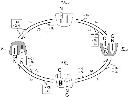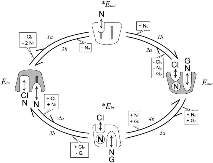Figure 1. GAT1 cotransport model. The transporter cartoons are all oriented with the extracellular side facing upward. Substrate dependencies of each reaction are indicated in a box. (−) A reaction can occur only when the given substrate is not bound; (+) a reaction can occur only when the given substrate is bound. The model assumes the existence of two stable GAT1 states (Ein and Eout) and two transitional GAT1 states (*Ein and *Eout). In the Ein state, one Cl− (Cl) and two Na+ (N) can bind sequentially from the cytoplasmic side. When Ein binding sites are empty, a Na+ binding site can open to the extracellular side to form the *Eout state. One extracellular Na+ ion can be bound in the *Eout state and occluded into the transporter, thereby forming the Eout state. The Eout state can bind sequentially one Na+, one Cl−, and one GABA (G). When the Eout binding sites are fully occupied, a transition to the *Ein state can occur in which GABA and one Na+ can dissociate to the cytoplasmic side. Further opening of binding sites returns transporters to the Ein state. Conformational changes of the transitional states (1b, 2b, 3b, and 4b) are assumed to take place at infinite rates. See text for further details.