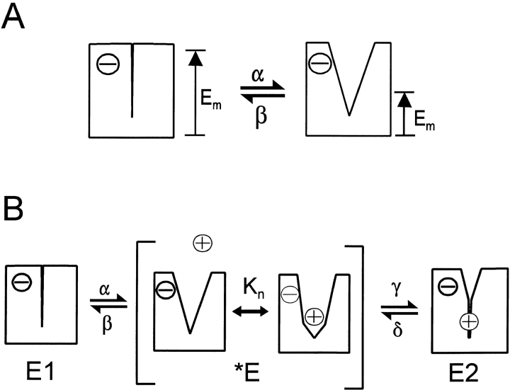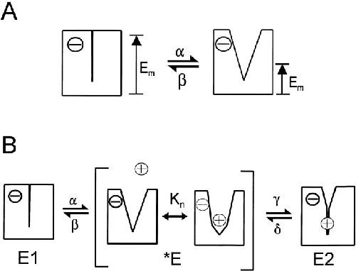 Figure 2. Hypothetical mechanisms of GAT1 electrogenicity. (A) Binding site opening reaction of an empty transporter. It is assumed that opening of the binding site changes the membrane potential profile across the transporter, such that the membrane electrical field moves across the charged binding site. The charge of the binding site, while open, remains outside the electrical field. Therefore, the binding site opening rate (α) will be more strongly voltage dependent than the closure rate (β). (B) Hypothetical mechanism of electrogenicity during Na+o occlusion by the GAT1 transporter. In the E1 state, binding sites are closed to the extracellular side. When they open, one Na+ can bind in the *E state, and the transporter binding sites close to the E2 state with an occluded Na+. In the opening reaction, the membrane field moves partially across the negatively charged binding site, and in the closing reaction, the membrane field moves in the opposite direction across the bound Na+. See text for further explanations.
