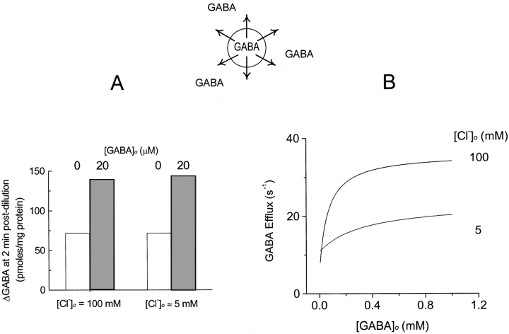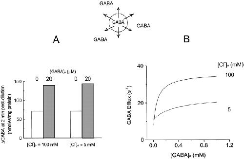Figure 5. Measured and predicted characteristics of GABAo-stimulated GABA efflux. (A) GABA efflux from outside-out synaptic vesicles (Kanner et al. 1983). Vesicles were loaded with GAT1 substrates by forward transport. GABA efflux was monitored as loss of labeled GABA from the vesicles after diluting them into solutions containing Na+. Extracellular GABA (20 μM) stimulates GABA efflux by about twofold in the presence of 100 mM Cl−o, as well as in its nominal absence (<5 mM). Stimulation of GABA efflux by GABAo required the presence of extracellular Na+. (B) Model predictions: extracellular GABA dependence of GABA efflux in the presence of 40 mM cytoplasmic NaCl, 20 mM cytoplasmic GABA, and 100 mM extracellular Na+ (0 mV). GABA efflux is increased about fourfold by GABAo in the presence of 100 mM Cl−o, and by about twofold in the presence of 5 mM Cl−o.