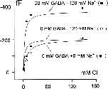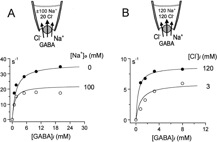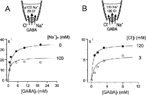 Figure 4. (A) GABA dependence of the outward transport current at 0 mV in the presence of 120 mM cytoplasmic Cl−, with and without 120 mM extracellular Na+. See text for details. (B) GABA dependence of the outward transport current at 0 mV in the presence of 120 mM extracellular NaCl, with 120 and 3 mM cytoplasmic Cl−.