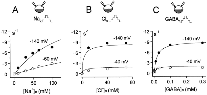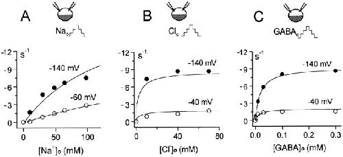 Figure 7. Extracellular substrate dependence of inward GAT1 current. (A) Extracellular Na+ dependence of current at −140 and −60 mV. (B) Extracellular Cl− dependence of current at −140 and −40 mV. (C) Extracellular GABA dependence of current at −140 and −40 mV. The experimental results are whole-oocyte currents (Mager et al. 1993). See text for further details.