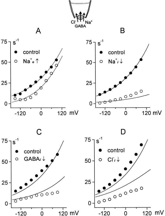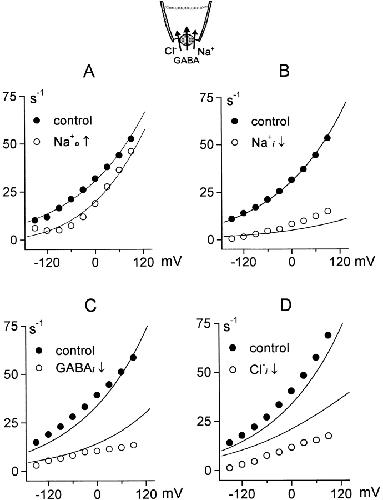 Figure 6. Current–voltage relations of outward GAT1 current. Fully activated outward current (120 mM NaCl and 20 mM GABA) is plotted in each case (•). (A) Inhibition of outward current by 100 mM extracellular Na+. (B) Inhibition of outward current by reducing the cytoplasmic Na+ concentration from 120 to 20 mM. (C) Inhibition of outward current by reducing cytoplasmic GABA from 20 to 0.5 mM. (D) Inhibition of outward current by reducing cytoplasmic Cl− from 120 to 15 mM. See text for further details.