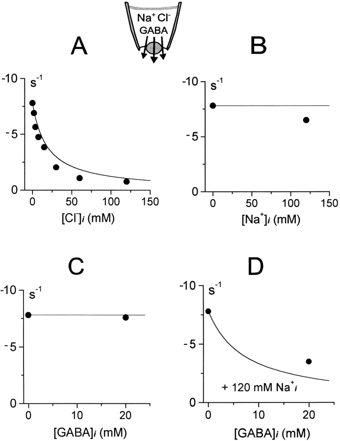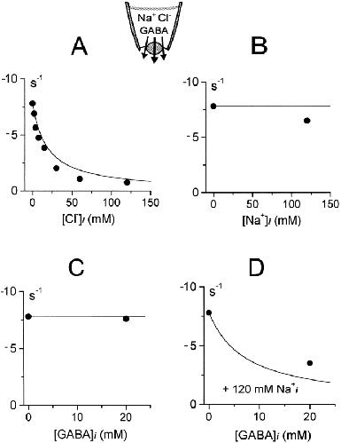 Figure 8. Cytoplasmic substrate dependence of inward GAT1 current. (A) Inhibition of inward GAT1 current by cytoplasmic Cl−. (B) Weak inhibition of inward GAT1 current by cytoplasmic Na+. (C) Lack of effect of GABAi on inward GAT1 current. (D) Weak inhibition of inward GAT1 current by GABAi in the presence of 120 mM cytoplasmic Na+ and no Cl−. See text for further details.