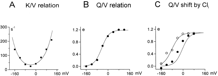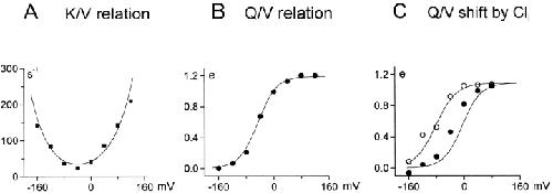 Figure 11. Rate– (K/V) and charge–voltage (Q/V) relations. (A and B) Results from an excised oocyte patch with 40 mM extracellular NaCl, simulated with 80 mM NaCl. (C) Effect of 120 mM cytoplasmic Cl− on Q/V relation of a patch with 120 mM extracellular NaCl. The simulated charge is calibrated as elementary charges (e) moved through membrane field per single transporter. See text for details.