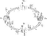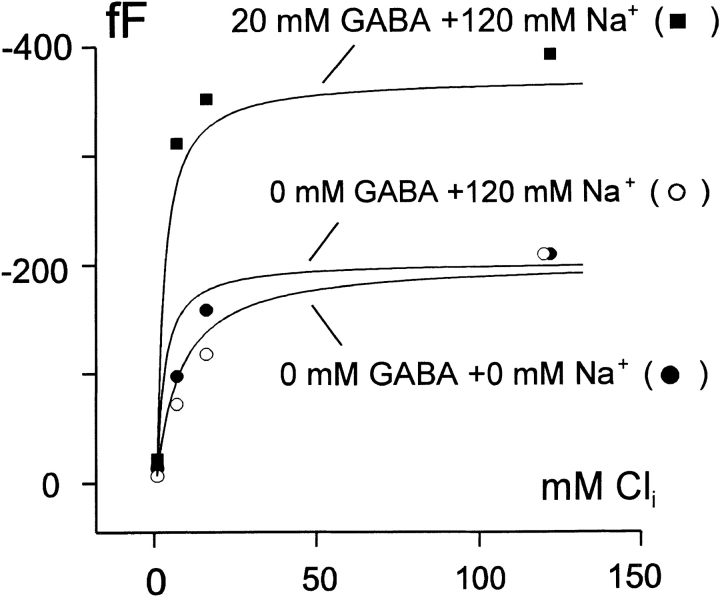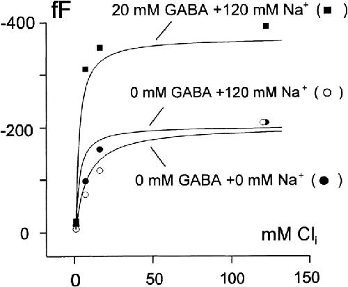 Figure 16. Simulation of GAT1-mediated membrane capacitance changes with application of cytoplasmic Cl−. Measured and predicted capacitance changes on application of cytoplasmic Cl− in the absence of cosubstrates (•), in the presence of 120 mM cytoplasmic Na+ (○), and in the presence of 120 mM cytoplasmic Na+ and 20 mM GABA (▪).
