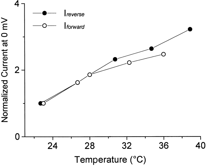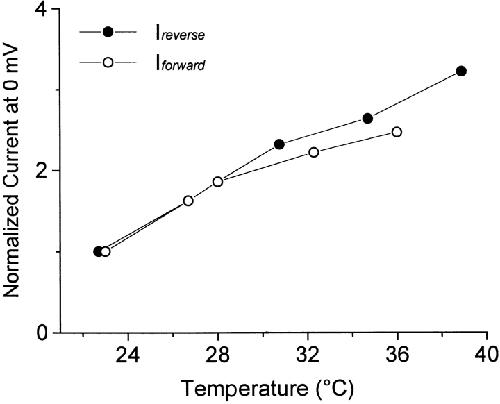 Figure 12. Temperature dependence of inward and outward GAT1 currents at 0 mV in excised oocyte patches. Inward current was recorded with 120 mM NaCl and 0.2 mM GABA on the extracellular side. Outward current was recorded with 120 mM NaCl and 20 mM GABA on the cytoplasmic side.