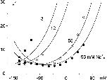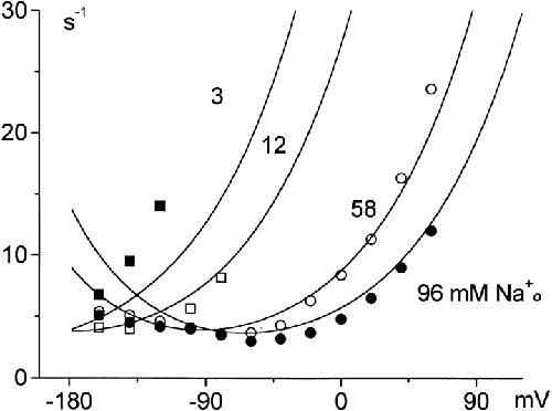 Figure 13. Voltage dependence of charge-movement rates in whole-oocyte voltage clamp with 96, 58, 12, and 3 mM extracellular Na+. The results are from Mager et al. 1996. See text for details.