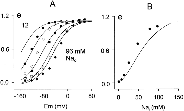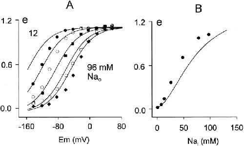 Figure 14. Voltage and extracellular Na+ dependence of GAT1 charge movements in whole-oocyte voltage clamp. The simulations are calibrated as elementary charges (e) moved through membrane field per single transporter. The results are from Mager et al. 1996. (A) Voltage dependence of charge moved at 96 (♦), 77 (□), 48 (▪), 24 (○), and 12 (•) mM extracellular Na+. (B) Na+i dependence of charge moved at −80 mV by application of 96 mM extracellular Na+.