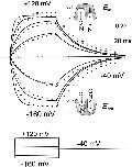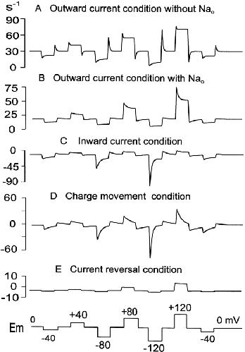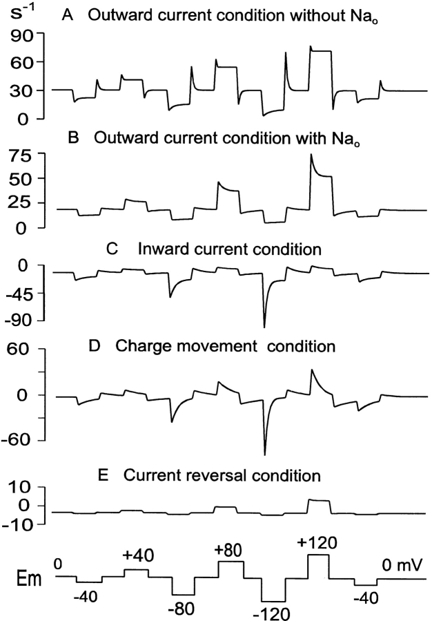 Figure 15. Predicted GAT1 pre–steady state current transients. The voltage protocol is given below the figure. These model results are comparable to experimental results described previously (Lu and Hilgemann 1999b). (A) Outward current condition without extracellular Na+: 120 mM cytoplasmic NaCl, 20 mM cytoplasmic GABA, and 20 mM extracellular Cl−. (B) Outward current condition as in A with additional 120 mM extracellular Na+. (C) Inward current condition: 120 mM extracellular NaCl, 0.2 mM extracellular GABA, and no cytoplasmic substrates. (D) Charge movement condition: 120 mM extracellular NaCl and no other GAT1 substrates. (E) Current reversal condition: 120 mM NaCl and 2 mM GABA on the extracellular side; 120 mM Na+, 6 mM Cl−, and 2 mM GABA on the cytoplasmic side. See text for complete details.