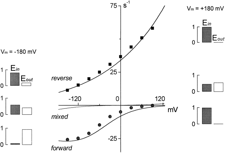 Figure 3. Current–voltage relations of the fully activated GAT cotransport currents. Here, and in subsequent figures, the steady state transport rate is plotted on the y axis. The data points are scaled membrane current values from experiments described previously (Lu and Hilgemann 1999a,Lu and Hilgemann 1999b). Solid curves are model predictions. The reverse (outward) current–voltage relation (▪) is with 120 mM cytoplasmic NaCl, 20 mM cytoplasmic GABA, and 20 mM extracellular Cl−. The forward (inward) current–voltage relation (•) is with 120 mM extracellular NaCl, 0.2 mM extracellular GABA, and no cytoplasmic substrates. The mixed current–voltage relation (dashed line) is with 120 mM NaCl on both membrane sides, 2 mM cytoplasmic GABA, and 0.2 mM extracellular GABA.
