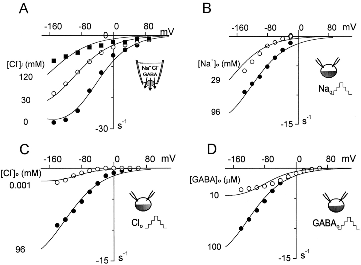 Figure 9. Current–voltage relations of the inward GAT1 current. (A) Inward GAT1 current in a giant patch with 0, 30, and 120 mM cytoplasmic Cl−. Results in B–D are whole-oocyte experiments (Mager et al. 1993), and the corresponding simulations assume 25 mM cytoplasmic Cl− and 12 mM cytoplasmic Na+. (B) Inward current with 96 and 29 mM extracellular Na+. (C) Inward current with 96 mM and nominally zero extracellular Cl−; the simulation is with 1 μM Cl−. (D) Inward current with 100 and 10 μM extracellular GABA. See text for further details.