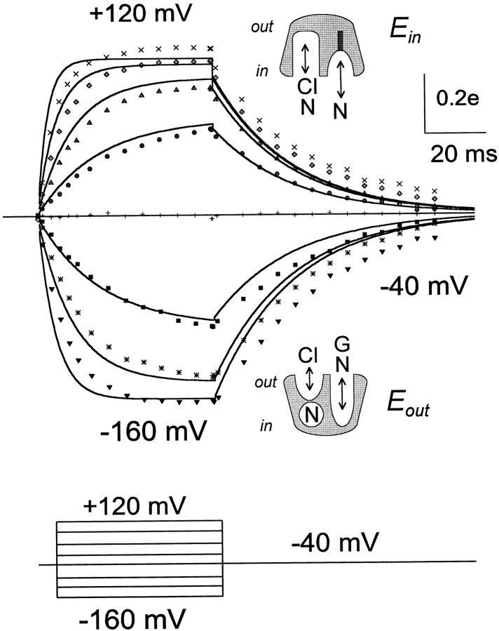 Figure 10. Simulated and measured GAT1 charge movements. The simulation is calibrated as elementary charges (e) moved through membrane field per single transporter. The experimental results are with 40 mM extracellular NaCl; the simulation is with 80 mM extracellular NaCl. As indicated by the cartoons, binding sites are expected to be open to the cytoplasmic side at positive potentials and to the extracellular side at negative potentials. See text for more explanations.