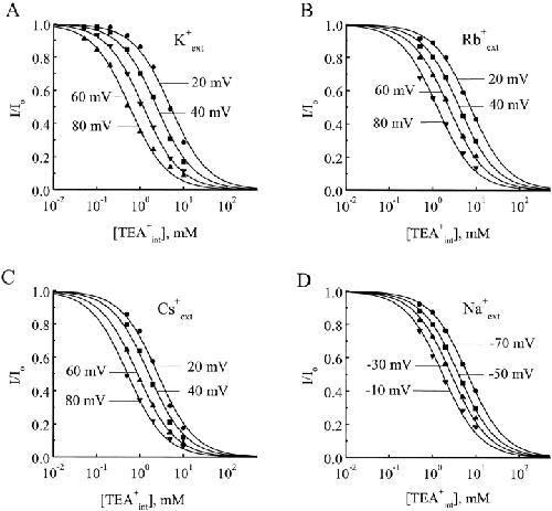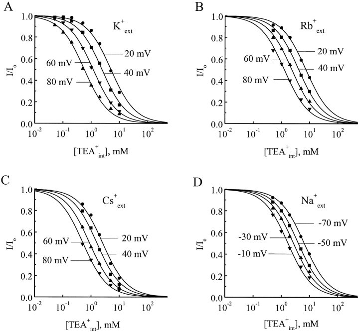 Figure 2. Tetraethylammonium inhibition curves. The fractions of unblocked currents (I/Io) were plotted against the concentration of intracellular TEA ([TEAint]) for several representative membrane voltages. Curves superimposed on the data correspond to least-squares fits using I/I0 = TEAKobs/(TEAKobs + [TEAint]), where TEAKobs is the observed TEA equilibrium dissociation constant. The alkali metal ions (100 mM) contained in the pipette solution were as indicated.