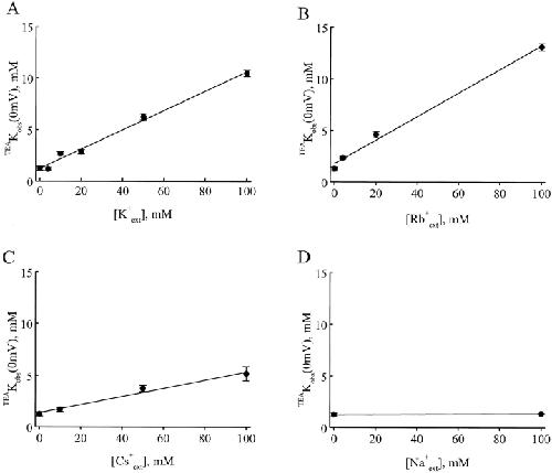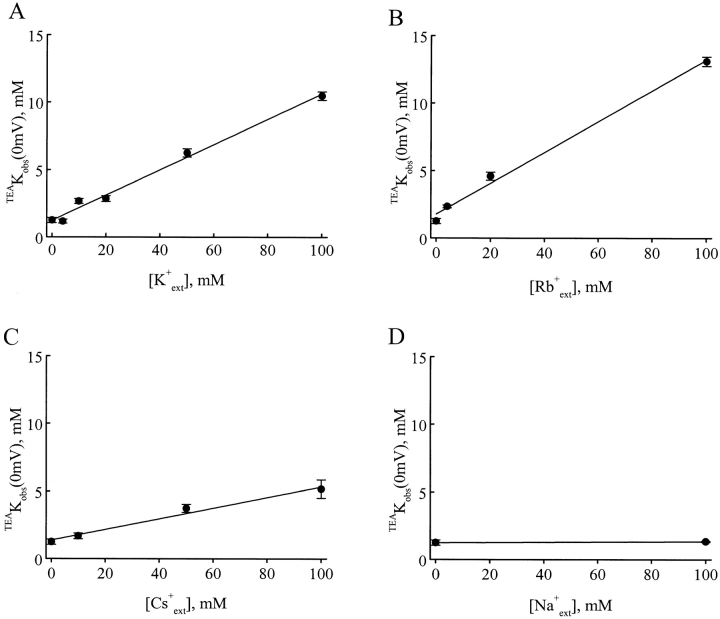 Figure 5. Dependence of TEAKobs(0 mV) on the concentration of extracellular alkali metal ions. TEAKobs(0 mV) values (mean ± SEM, n = 5) are plotted against the concentration of extracellular K+, Rb+, Cs+, or Na+. The values of TEAKobs(0 mV) were obtained as shown in Fig. 3. (A–C) When the concentration of K+, Rb+, or Cs+ was reduced, Na+ was used as a substitute. (D) The Na+-free solution contained 100 mM NMG+. The lines superimposed on the data represent fits of (see discussion).