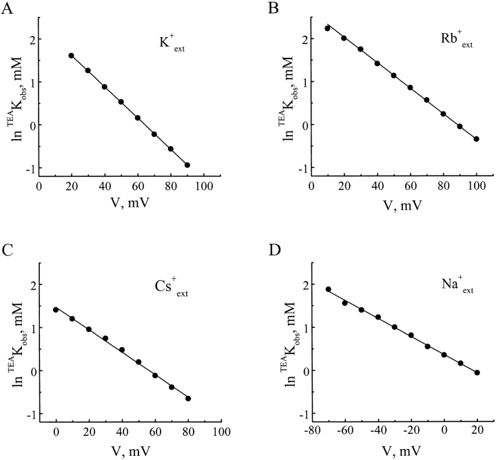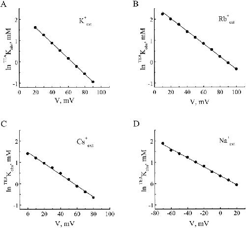 Figure 3. Dependence of TEAKobs on membrane voltage. The natural logarithms of TEAKobs values obtained in Fig. 2 were plotted against membrane voltage. The lines superimposed on the data are least-squares fits of the Woodhull equation (Woodhull 1973), lnTEAKobs = lnTEAKobs(0 mV) − TEA(zδ)obsFVm/RT. The alkali metal ions (100 mM) contained in the pipette solution were as indicated.
