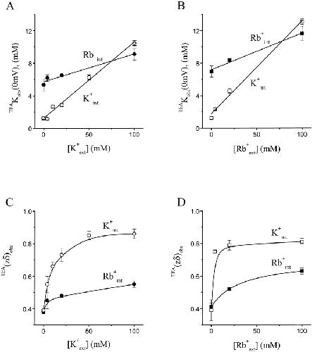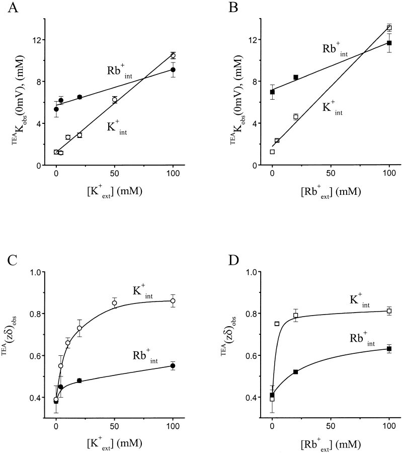 Figure 7. Effects of intracellular permeant ions on channel blockade by intracellular TEA. (A and B) TEAKobs(0 mV) (mean ± SEM, n = 5) are plotted against the concentration of extracellular K+ in A and Rb+ in B. Data in the open symbols were obtained in 100 mM intracellular K+, while data in the closed symbols were obtained in 100 mM intracellular Rb+. The lines superimposed on the data correspond to . (C and D) The values of TEA(zδ)obs (mean ± SEM, n = 5) are plotted against the concentration of extracellular K+ in C and Rb+ in D. Data in the open symbols were obtained in 100 mM intracellular K+, while data the in closed symbols were obtained in 100 mM intracellular Rb+. The curves superimposed on the data have no theoretic meaning.
