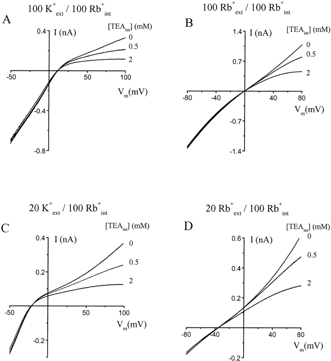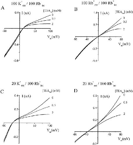 Figure 6. Blockade of the ROMK1 channel by intracellular TEA in the presence of intracellular Rb+. Macroscopic I–V curves of the ROMK1 channel were recorded in the absence or presence of various concentrations of intracellular TEA. The pipette solutions contained 100 mM K+ (A), 100 mM Rb+ (B), 20 mM K+ (C), and 20 mM Rb+ (D). The bath solution contained 100 mM of Rb+ in all four cases.