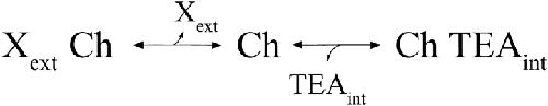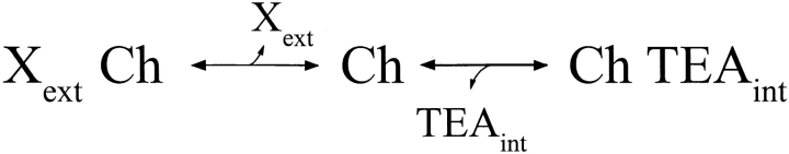 Figure 8. A kinetic state diagram. Extracellular ion X and intracellular TEA bind competitively to a channel (Ch).