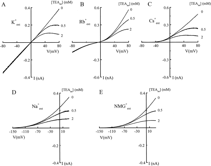 Figure 1. Voltage-dependent block of the ROMK1 channel by intracellular TEA in various extracellular alkali ions. Macroscopic I–V curves of the ROMK1 channel were recorded in the absence or presence of various concentrations of intracellular TEA. The pipette solutions contained 100 mM of either K+, Rb+, Cs+, Na+, or NMG+. The bath solution contained 100 mM K+ in all cases.