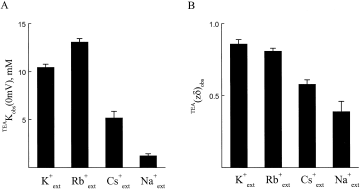 Figure 4. The values of TEAKobs(0 mV) and TEA(zδ)obs determined in various extracellular alkali metal ions. TEAKobs(0 mV) and TEA(zδ)obs values (mean ± SEM, n = 5) obtained in the presence of 100 mM of each of the four alkali metal ions are presented in A and B, respectively. The data were obtained as shown in Fig. 3.