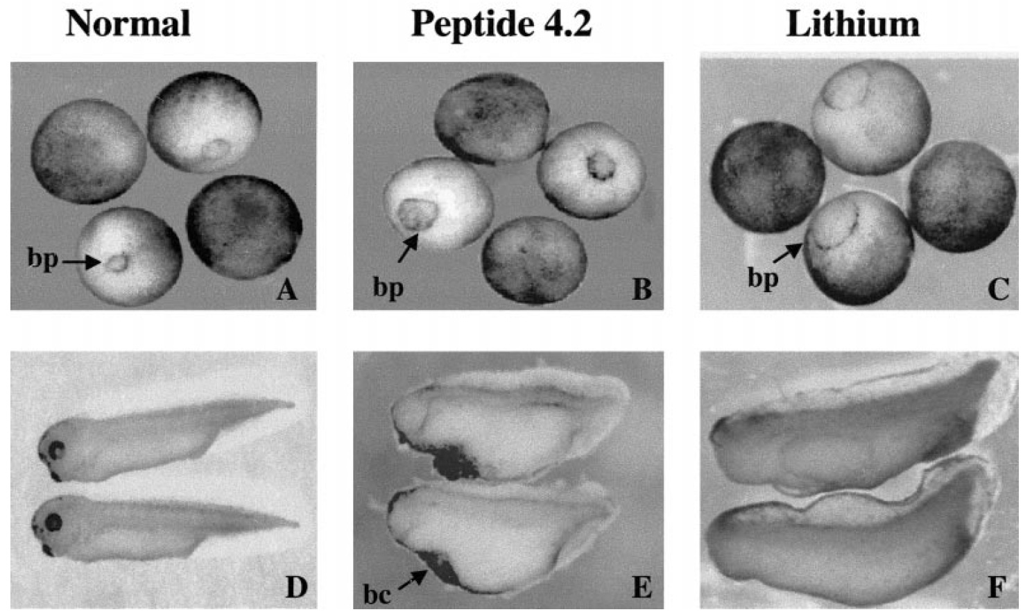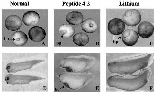 neural tube, notochord) was not significantly affected by injection of either peptide 4.2 or LiCl. bc, blastocoele cavity; bp, blastopore.