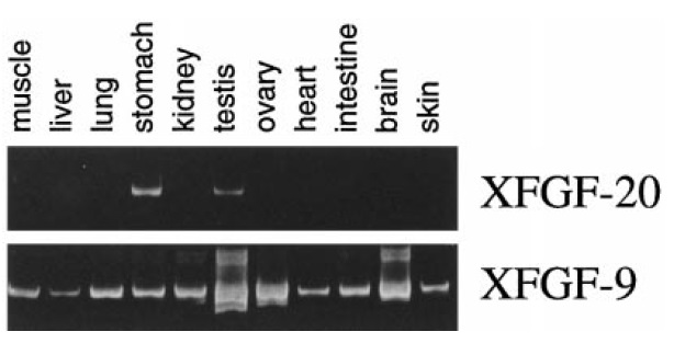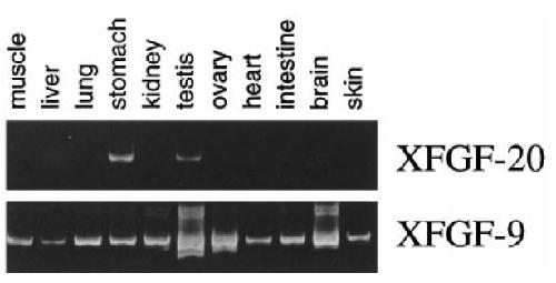 FIG. 3. Expression of XFGF-20 and XFGF-9 mRNAs in adult
