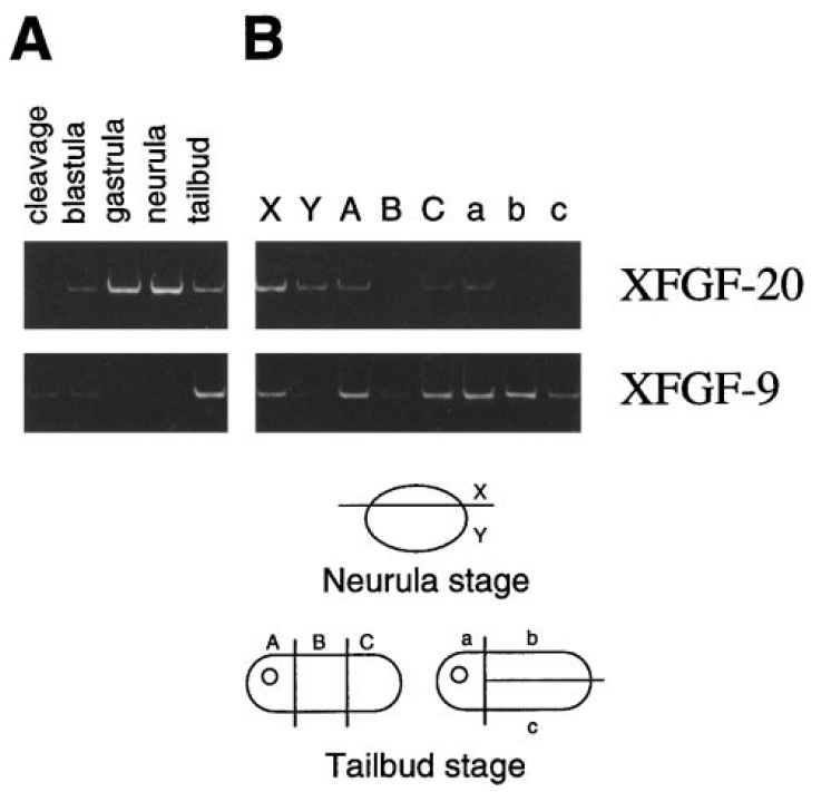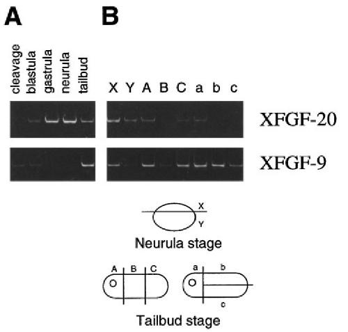 Expression of mRNAs for XFGF-20 and XFGF-9 during early development.