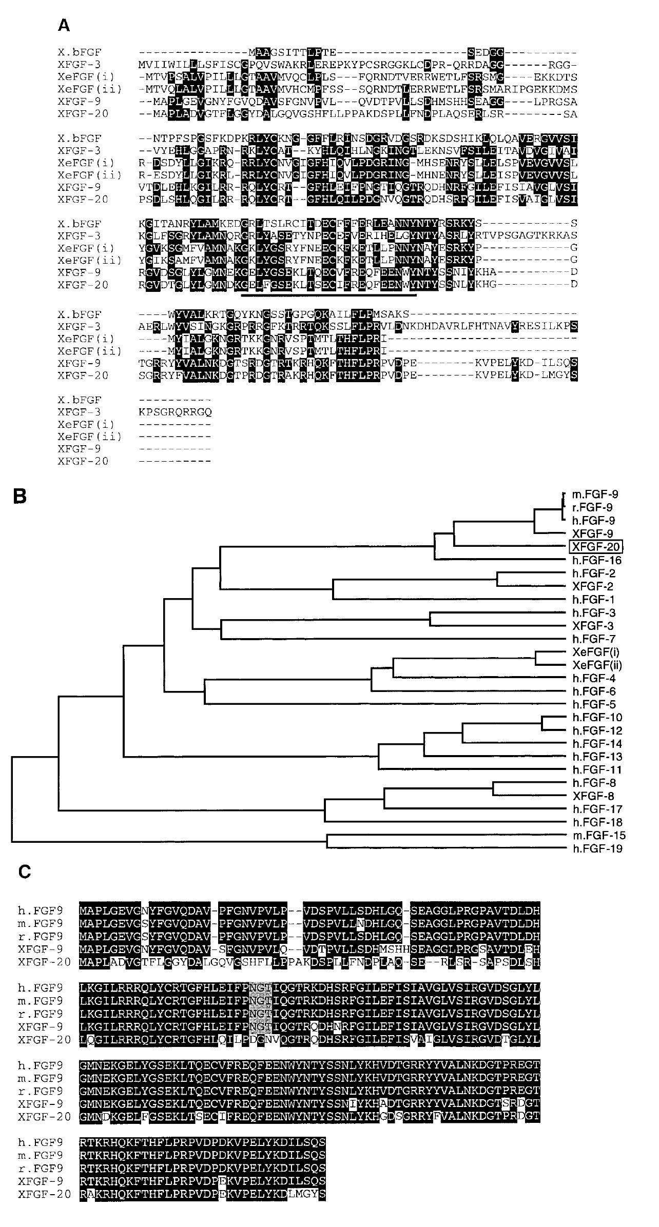 Xenopus; Xe, Xenopus embryonic. (C) An alignment of the deduced amino acid sequence of XFGF-20 with those of various FGF-9. Identical