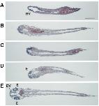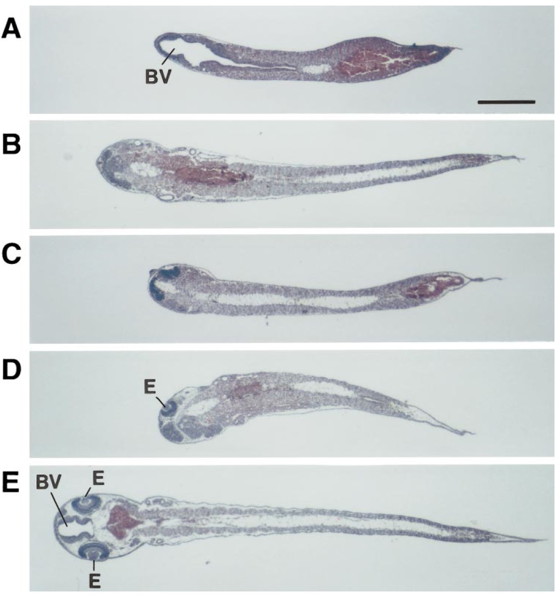 that had been injected with XFGF-20 mRNA. (E) A control uninjected embryo. BV, brainventricle; E, eye. Scale bar, 500 mm.