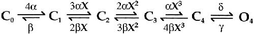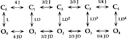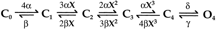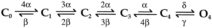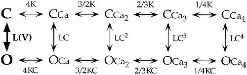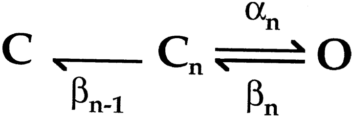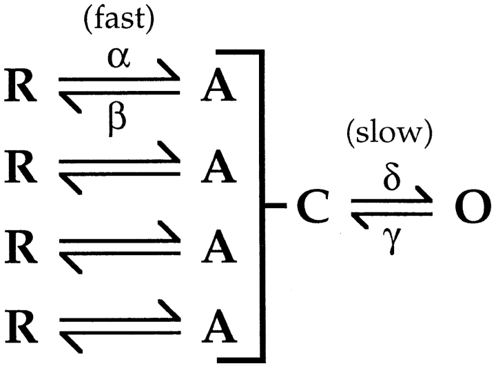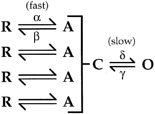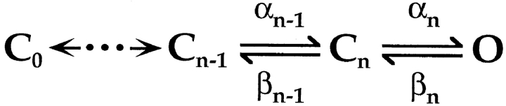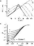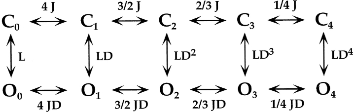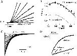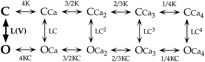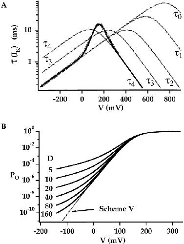 Figure 10. Properties of the allosteric voltage-gating scheme. (A) The τ(IK)–V relationship determined by simulating Fig. 9 (•; Table : average 5°C) can be reproduced by an analytical approximation (solid line) that assumes horizontal transitions are equilibrated. The voltage dependence of time constants for individual C–O transitions are also plotted (τi = [δi + γi)−1]. (B) Po–V relationships predicted by Fig. 9 (solid lines) are plotted on a semi-log scale as the allosteric factor D is adjusted [with zL = 0.4 e, zJ = 0.55 e, Vh(J) = 145]. The equilibrium constant L was adjusted together with D such that the half-activation voltage remained constant (for D = 5–160: L = 2.18 e−4, 1.57 e−5, 1.05 e−6, 6.80 e−8, 4.33 e−9, and 2.72 e−10). A dashed line indicates the prediction of sequential Fig. 5 (from Fig. 6).