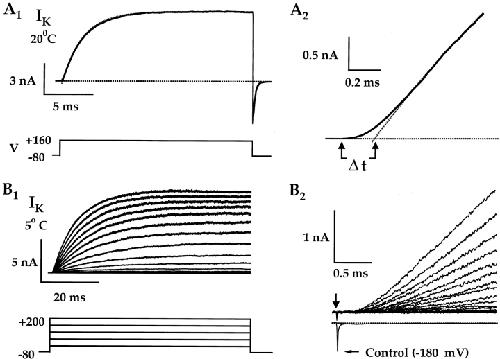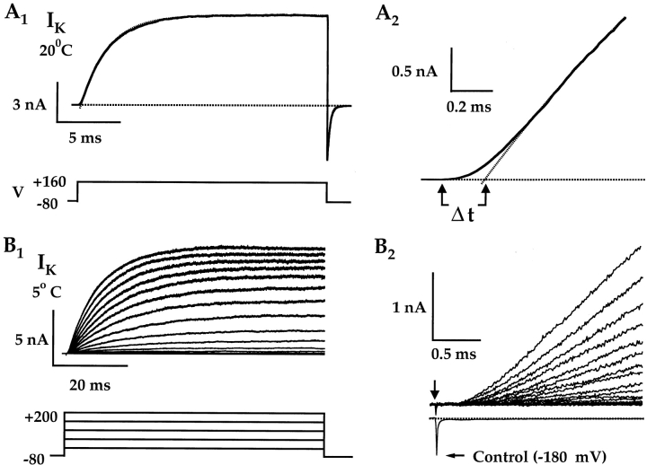 Figure 1. Delay in IK activation. (A1) IK evoked by a voltage pulse to +160 mV from a holding potential of −80 mV at 20°C, representing the average response to 110 pulses. The time course of activation and deactivation are fit by exponential functions (dashed lines). (A2) The record from A1 is plotted on an expanded time scale, showing a delay before IK achieves an exponential time course (dashed line). The delay duration (Δt) is defined as the time where the exponential fit intersects the time axis, and was determined after shifting the IK trace along the time axis by −25 μs to correct for instrumentation delay (see methods). (B1) A family of IK evoked at 5°C in response to 70-ms voltage pulses (+80 to +200 mV in 20-mV steps). Exponential fits (solid lines) are superimposed on the current traces. (B2) The initial activation of IK from B1 exhibits a clear delay. An arrow indicates the start of the voltage pulse. A capacitive transient (control) evoked in response to a pulse to −180 mV was recorded using fast capacity compensation, but no leak subtraction, demonstrating that membrane voltage settles rapidly.
