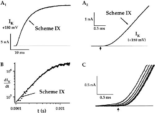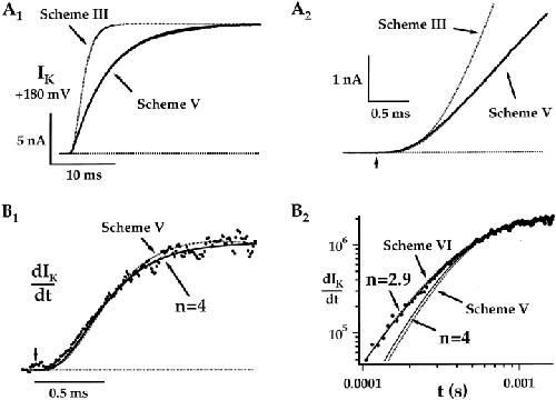 Figure 2. Kinetics of IK delay. (A1) IK evoked at +180 mV (7°C) is compared with the prediction of a Hodgkin-Huxley model (Scheme III: α = 375 s−1, β = 660 s−1) that approximates the delay in IK (A2), but does not reproduce the subsequent time course of activation. Fig. 5 fits both the delay and activation time course (α = 2,018 s−1, β = 1,172 s−1, δ = 341 s−1, γ = 136 s−1). Both models were constrained to reproduce the steady state open probability measured at the end of the pulse (Po ≅ GK/GKmax = 0.29) and assume channels occupy the first closed state (C0) at the start of the pulse. The derivative of the trace in A [d(IK)/dt] is plotted on linear (B1) and log–log (B2) scales and is fit by a function (1 − e−t/τ)n, where n = 4 and τ = 270 μs (B1 and B2, solid line). A better fit is obtained with n = 2.9 and τ = 316 μs (B2, solid line). The predictions of sequential gating Fig. 5 and Fig. 6 are indicated by dashed lines. (Scheme VI: X = 3, α = 600 s−1, β = 349 s−1,δ = 341 s−1, γ = 136 s−1). Current traces were shifted along the time axis by −25 μs to correct for the instrumentation delay (see methods).