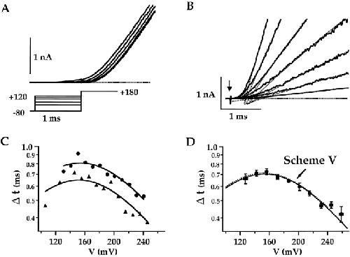 Figure 3. Voltage dependence of IK delay. (A) The initial time course of IK activation measured at +180 mV from the same patch as Fig. 2 shows a decreased delay following a 1-ms prepulse to various voltages (−80, 0, 40, 80, 100, and 120 mV). To accurately represent the time course of channel opening, currents during the prepulse were scaled by a factor IK(+180)/IK(Vpre) representing the ratio of single channel current amplitudes measured at the test and prepulse voltages. (B) A family of IK evoked at different voltages (+120 to +240 in 20-mV steps, holding potential = −80) are fit with exponential functions (dashed lines), demonstrating a voltage-dependent change in delay. (C) Delay duration (Δt) is plotted versus pulse voltage for two experiments. The plots are fit by functions of the form Δt = 1/(a + b) with a=ao*ezaekt,b=bo*ezbekt(za = +0.28 e, zb = −0.28 e ; (▴) ao = 124 s−1, bo = 4,767 s−1; (•) ao = 98 s−1, bo = 3,902 s−1). The delay was not well determined at the lowest voltages; therefore, fits were constrained with the simplifying assumption za = zb. (D) The average Δt–V relationship (mean ± SEM, n = 6), was obtained after first normalizing individual plots (see text) to mean Δt measured from +180 to +195 mV. The data are fit by the above function (solid line, za = +0.28 e; zb = −0.28 e ; ao = 119 s−1, bo = 4,240 s−1) and reproduced by Fig. 5 [dashed line: zα = +0.28 e, α(0) = 244 s−1, zβ = −0.28 e, β(0) = 8,670 s−1, zδ = 0.155 e, δ(0) = 49.4 s−1, zγ = −0.155 e, γ(0) = 134 s−1]. The rate constants in Fig. 5 that describe voltage sensor movement (α, β) are 2.05-fold greater than (a, b) at all voltages. Thus Δt = 1/(a + b) is proportional the voltage-sensor time constant τ = 1/(α + β). The parameters that describe the C–O transition in Fig. 5 (δ, zδ, γ, zγ), were adjusted to fit the Po–V relationship (see Fig. 6 B) and to reproduce the time course of IK activation at the peak of the Δt–V relationship (+153 mV).