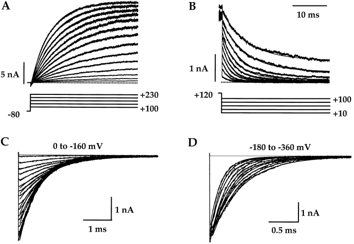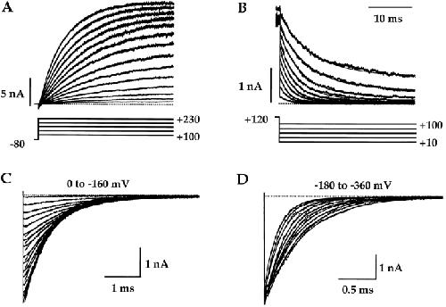 Figure 4. The voltage-dependence of IK relaxation. (A) Activation and (B–D) deactivation kinetics measured at 5°C are fit by exponential functions (solid lines). IK was activated in response to voltages from +100 to +240 mV. Deactivation was measured at the indicated voltages after a 50-ms depolarization to +120 mV.