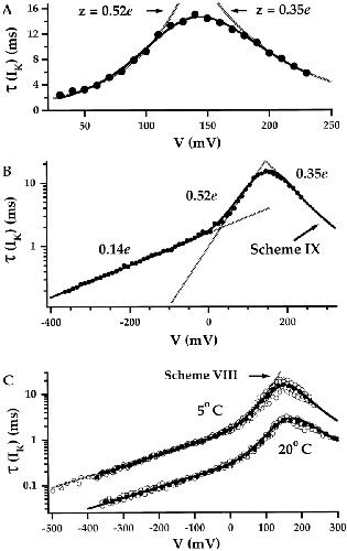 Figure 5. The voltage dependence of τ(IK). (A) Time constants [τ(IK)] from the fits in Fig. 4A and Fig. B, are plotted versus voltage and fit (dashed line) by two exponential functions with the indicated equivalent charge (z). The prediction of a two-state model [τ(IK) = 1/(a + b), a=ao*ezaekt,b=bo*ezbekt] is indicated by a solid line (za = 0.37 e, zb = 0.67 e ; ao = 4.86 s−1, bo = 1,323 s−1). (B) τ(IK) is plotted on a log scale versus voltage for all the records in Fig. 4. Data were shifted along the voltage axis by ΔVh = +5.6 mV (see methods). Three regions of exponential voltage dependence are shown by dashed lines with the indicated equivalent charges (z). A solid curve indicates a fit to Fig. 9 (Table , Patch 1). (C) τ(IK)–V plots obtained from multiple experiments at 5° and 20°C (○) were normalized to mean τ(IK) at −80 mV, and then averaged in 15-mV bins (•). Solid curves indicate fits of Fig. 9 to the averaged data (Table : average 5° and 20°C). The dashed curve represents a fit of Fig. 8 to the average 5°C data for V < +100 mV (zβ1 = −0.45 e, β1(0) = 2,400 s−1, zβ2 = −0.14 e, β2(0) = 700 s−1, zα2 = −0.26 e, α2(0) = 300 s−1).