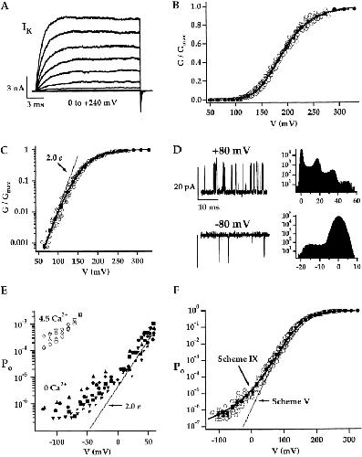 Figure 6. Steady state activation. (A) A family of IK evoked in response to 20-ms depolarizations (+80 to +280 in 20-mV steps, holding potential = −80, 20°C). GK(V) was determined by measuring the tail current amplitude at −80 mV immediately after each pulse. (B) The GK–V relationships from 23 experiments (○) were normalized by GKmax and shifted along the voltage axis to align half-activation voltages (see methods). The average G–V (•) represents the mean ± SEM of the normalized-shifted data determined over 15-mV intervals. A Boltzmann function raised to a power of 3.2 (z = 0.69 e, solid line) represents the best fit to the individual data, excluding experiments where Vmax < 240 mV. GKmax could not be directly determined for the excluded experiments; therefore, these data were normalized based on the Boltzmann3.2 fit. Dashed lines indicate predictions of Fig. 5 [∈ = δ/γ, ∈(0) = 0.367, z∈ = 0.295 e, zJ = 0.55 e, Vh(J) = 145] and Fig. 9 [L(0) = 2 e−6, zL = 0.4 e, zJ = 0.55 e, Vh(J) = 145, D = 17]. (C) The data are replotted on a semi-log scale together with the Boltzmann3.2 fit (solid line). The maximum voltage dependence of G–V is indicated by a dashed line (z = 2.0 e). (D) Single channel currents were recorded at the indicated voltages and filtered at 20 kHz. The corresponding all-points histograms are plotted on a semi-log scale (points versus picoamperes). (E) Normalized open probability (Po/Pomax, see text) determined from single channel currents is plotted versus voltage for several experiments in 0 Ca2+ (filled symbols) or 4.5 μM Ca2+ (open symbols). The dashed line indicates the maximum voltage dependence of the macroscopic G–V from C. (F) The normalized Po–V relationship from −120 to +300 mV combines the macroscopic and single channel data. Filled symbols indicate averages (mean ± SEM, 15-mV bin width), while open symbols represent data from individual experiments. Predictions of Fig. 5 (dashed line) and IX (solid line) are the same as in B.
