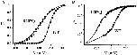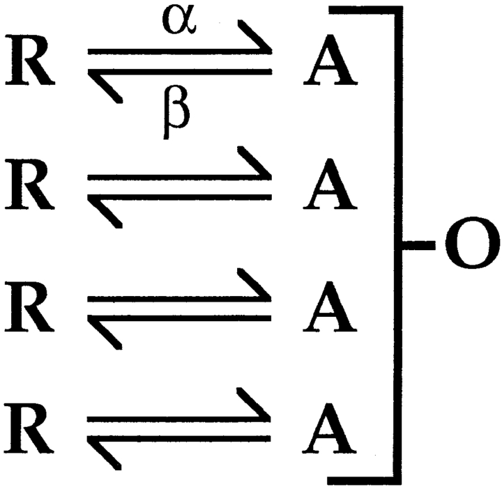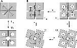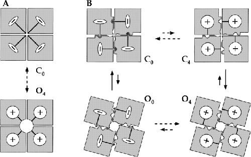 Figure 11. Interaction between voltage sensors and channel gating. Cartoons illustrate two hypothetical mechanisms of coupling between voltage-sensor movement and channel opening. Voltage sensors in each subunit are shown to undergo a transition between resting (−) and activated (+) conformations. For simplicity, only states with all four voltage sensors in the same conformation are shown. The independent transitions of voltage sensors are abbreviated by dashed arrows. (A) A direct coupling mechanism assumes there exists a direct physical link between voltage sensor and a gate that controls the flow of ions through the pore. Such a mechanism does not allow channels to open unless voltage sensors are activated. (B) An allosteric mechanism assumes that channel opening involves a quaternary rearrangement of subunits that alters subunit–subunit interactions (indicated by shaded areas between subunits). Voltage-sensor activation is also assumed to affect subunit–subunit interaction, and is shown here as stabilizing the closed state when voltage sensors are in the (−) conformation.