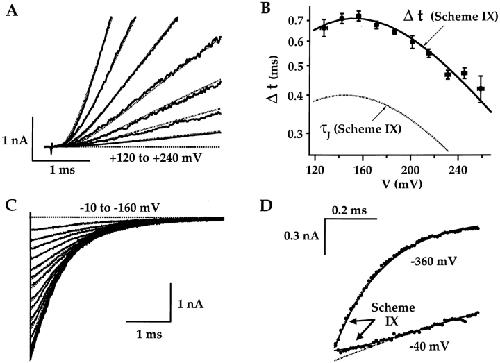Figure 8. Allosteric model: voltage dependence of IK kinetics. (A) The initial time course of IK activation at different voltages (from Fig. 3 B, 5°C) are fit by Fig. 9 (Table : Patch 1, ΔVh = +5.6 mV). (B) The average Δt–V relationship (from Fig. 3 D) is compared with the prediction of Fig. 9 for Δt (solid line) and the time constant of voltage-sensor movement τJ = 1/(α + β) (dashed line). (Table : average 5°C). (C) Fig. 9 (dashed lines; Table : Patch 1, ΔVh = +5.6 mV) predicts a delay in tail currents measured from 0 to −160 mV (from Fig. 4 C). (D) Tail currents and Fig. 9 predictions (solid line) at −40 and −360 mV show initial deviation from an exponential fit (dashed lines, from Fig. 4C and Fig. D) at −40 mV, but not at −360 mV. Thus, a tail current delay is observed, but not at very negative voltages.