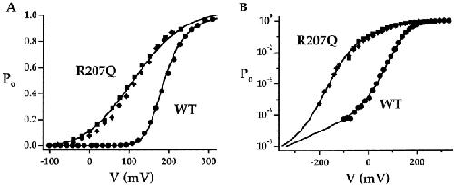 Figure 9. Effect of S4 mutation. GK–V relationships for mSlo WT and S4 mutant R207Q in 0 Ca2+ were obtained using both macroscopic and single channel currents as in Fig. 6 and are plotted on linear (A) and semi-log (B) scales. Fig. 9 was used to fit both relationships (solid lines). Parameters are the same as in Fig. 6 [L(0) = 2 e−6, zL = 0.4 e, zJ = 0.55 e, D = 17], except Vh(J) = −100 mV for R207Q, while Vh(J) = 145 mV for WT.