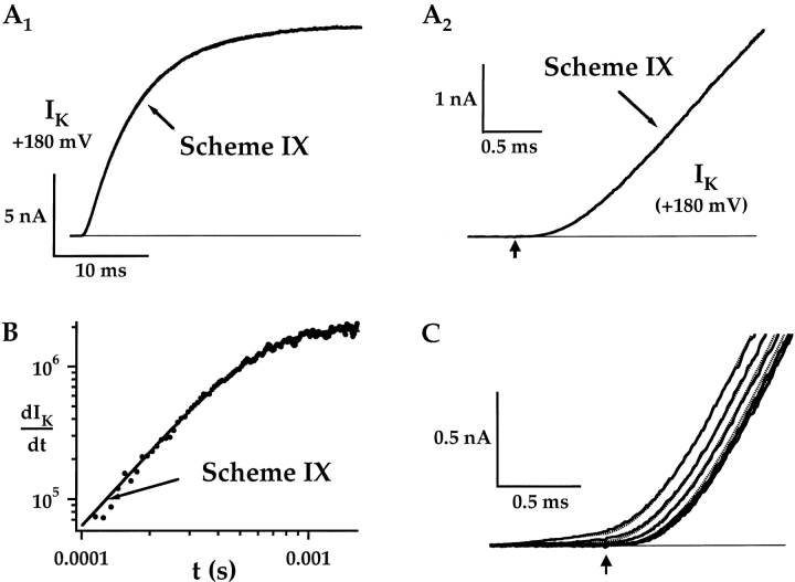 Figure 7. Allosteric model: IK kinetics. Fig. 9 was used to fit the time course of mSlo IK (solid lines; Table : Patch 2, ΔVh = −11.3 mV). (A1 and A2) IK evoked at +180 mV at 7°C (from Fig. 2 A). (B) d(IK)/dt is plotted on a log–log scale (from Fig. 2 B2). (C) The Cole-Moore shift (from Fig. 3 A).