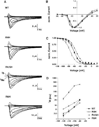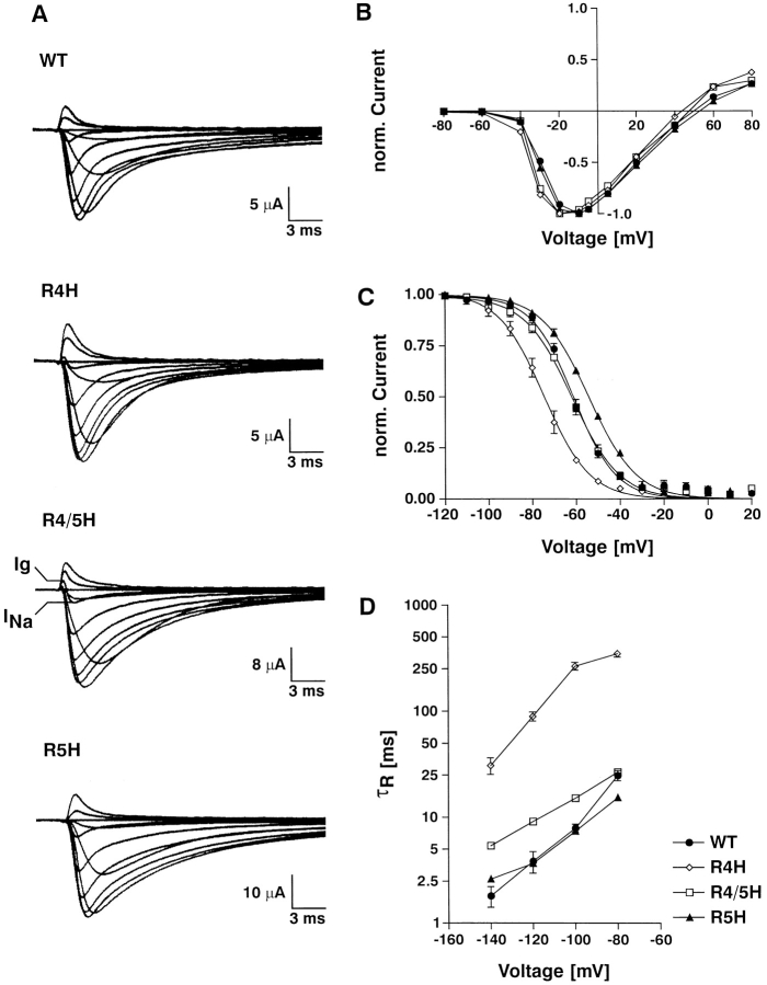Figure 1. Effects of S4D4 point mutations on macroscopic Na+ currents. (A) Na+ currents from WT-, R4H-, R4/5H-, and R5H-injected Xenopus oocytes elicited by step depolarizations from −80 to 80 mV, holding potential −100 mV. A single trace displaying an outward gating current followed by an inward ionic current near sodium reversal potential is indicated in R4/5H. (B) Corresponding current–voltage relationship of peak Na+ currents, normalized to the largest inward current. (C) Steady-state inactivation at 0 mV induced by a 100-ms prepulse at voltages between −120 and 20 mV, increments of 10 mV, holding potential −100 mV. The curves are fitted to a standard Boltzmann distribution with slopes and V0.5 given in the text. Values are mean ± SEM of n > 3 cells. (D) Semilogarithmic plot of time constant and voltage of recovery from fast inactivation. Pulse protocol: a 80-ms test pulse to 0 mV was preceded by a 100-ms pulse to 0 mV and variable recovery periods at four different holding potentials (−80, −100, −120, and −140 mV). Values are mean recovery time constants in milliseconds ± SEM of n = 1–7 cells; WT, 1.8 ± 0.6 (−140 mV), 3.9 ± 1.8 (−120 mV), 7.9 ± 1.5 (−100 mV), 24.8 ± 6.0 (−80 mV); R4H, 30.8 ± 9.6 (−140 mV), 89.4 ± 19.3 (−120 mV), 264 ± 59 (−100 mV), 347 ± 55.1 (−80 mV); R4/5H, 5.4 ± 0.5 (−140 mV), 9.1 ± 0.9 (−120 mV), 15.1 ± 0.8 (−100 mV), 26.7 ± 1.8 (−80 mV); R5H, 2.6 (−140mV), 3.7 ± 0.2 (−120 mV), 7.4 ± 0.6 (−100 mV), 15.4 ± 0.9 (−80 mV).