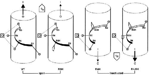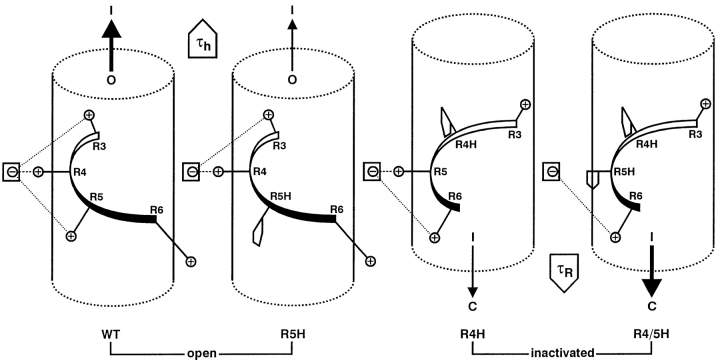 Figure 9. Scheme of possible interactions of the central arginines of S4D4 with a putative counter-charge that could explain the different inactivation behavior of the mutants. Illustrated is the central section of S4D4 containing the highly conserved central arginines R3–R6; the hypothetical negative counter-charge is indicated. WT and R5H are shown in the open state and R4H and R4/5H are shown in the inactivated state. Compared with WT, the O → I transition is considerably slowed in R5H (indicated by a thin arrow) and moderately slowed in R4H (not illustrated). This is due to the electrostatic asymmetry resulting from the interaction of the negative counter-charge with the neighbored arginines and histidines in the single mutants. On the other hand, the I2 → C2 transition (recovery from inactivation) is for the same reason drastically slowed in R4H (indicated by a thin arrow) and hardly affected in R5H (not illustrated). In contrast, WT and R4/5H display more symmetrical electrostatics, but due to the considerably altered structure in the double mutant, the mobility of S4D4 is slowed in both directions.