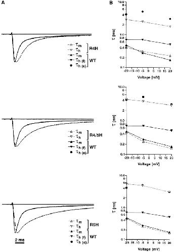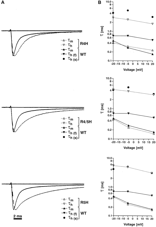 Figure 2. Effects of S4D4 point mutations on kinetics and on voltage dependence of macroscopic Na+ currents. (A) Comparison of normalized single current traces of WT (solid line) and mutant (dotted line) channels, elicited by a depolarizing pulse to −5 mV from a −100-mV holding potential. The settling times of the corresponding capacitance transients are almost identical (data not shown). (B) Semilogarithmic plots of single (mutants) or double (WT inactivation) exponential fits, as indicated, from representative current traces elicited by depolarizing pulses to −20, −5, and 20 mV; holding potential −100 mV. Single fits accord to the following equation. INa(t) = A * (1 − exp (−t/τm))3*exp(−t/τh) + P * (1 − exp(−t/τm))3. WT: (τm/τh (fast)/τh (slow) in ms) 0.48/0.70/4.20 (−20 mV); 0.28/0.70/5.10 (−5 mV); 0.17/0.51/3.10 (20 mV); R4H: (τm/τh in ms) 0.41/2.90 (−20 mV); 0.31/2.50 (−5 mV); 0.23/1.80 (20 mV); R4/5H: (τm/τh in ms) 0.45/4.30 (−20 mV); 0.24/3.80 (−5 mV); 0.15/2.90 (20 mV); R5H: (τm/τh in ms) 0.45/5.50 (−20 mV); 0.25/4.90 (−5 mV); 0.16/3.10 (20 mV).