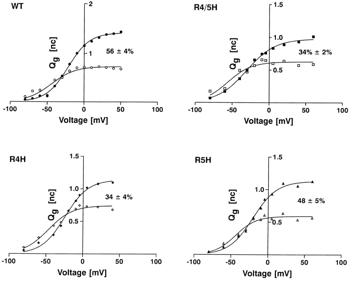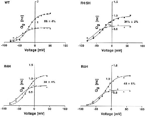 Figure 4. Charge–voltage (Q/V) distributions in WT and mutant sodium channels. Open symbols are data obtained in the presence of a 20-ms inactivating prepulse to 0 mV (1-ms interval at −100 mV). Filled symbols are data without prepulse; test pulses were 13 ms long. The gating charge (Qg) represents the time integral of the corresponding gating current. The individual Q/V curves were fitted by a Boltzmann distribution as described in Table . The degree of immobilization at Qmax derived as mean value ± SD from Table is indicated in each diagram.